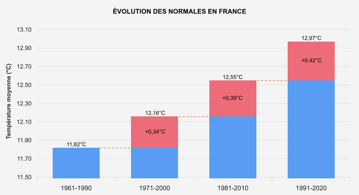 Sur ce graphique on constate entre 1961 et 2020, une hausse de 1,15 degré comparé aux normales de saisons en France. Source : Météo France. ©L.D