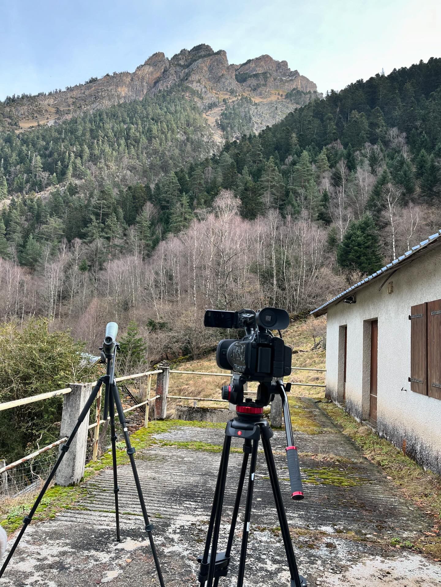 Après s’être équipé : polaires, chaussures de marche, jumelles et télescope optiques, George est prêt à partir. On monte en voiture - électrique comme nous l’avait confié Marie Cayre - direction la Vallée de Rioumajou. 20 minutes plus tard nous nous posons dans une ancienne colonie de vacances désaffectée.